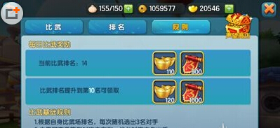 3、每场比武胜利后就立即获得PVP积分,比武场是根据PVP积分进行排名的,每天21点都会发放超豪华的排名奖励(含大量元宝,铜钱及海量声望)。
