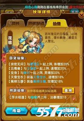 附加仙缘分装备和人物分别分三种品级,以人物为例子,分别是绿花,蓝花,紫花, 花可以开箱子开到品级越高属性越高每一个品级分1-5星属性,星级越高属性越高,附加属性共有五种随机出现:闪避,化解,神击,暴击,反击。推荐火系暴击,土系化解,武系闪避,武系反击,风系和雷系法暴。在选择附加仙缘的时候尽量选择品质高的仙缘,这样我们所获得的属性加成就会越高。不过这也需要根据伙伴的等级有联系,伙伴的等级越高,属性的加成也就会越高。