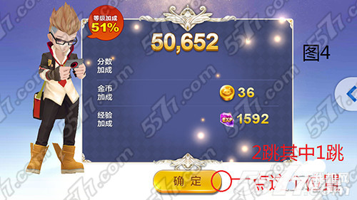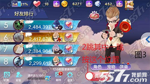 再按第2跳,游戏结束结算以后点确认的大概位置(尽量往右下边点,因为往上会点到游戏结束后的砖石复活,太往左等游戏开始的时候会点上助跑名单,见图5,)