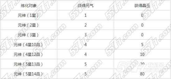 炼化可以获得元气和晶玉,根据炼化的元神品级不同,获得量也不同,具体如下表: