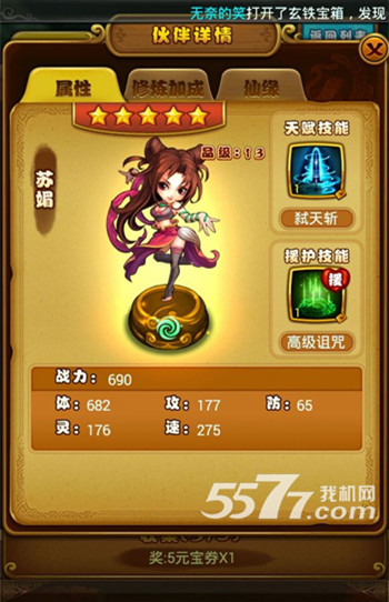 高速,技能第二回合可以抢输出(随机略坑),普攻伤害也不算太低,还带法爆,注定了她的输出不会低。缘分七七小虎的速缘很关键,七七的攻缘是锦上添花,没有七七用起来总觉得不太顺手,我第一个必出就这货,然后被我炼化了。。第四章漫山遍野的土,用风神还是很好用的。+4效果太差,减半星