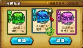 附缘品质有三种:缘起莲、今生莲、百世莲,附缘后,如果觉得不满意,可以选择重附!当然还会消耗1个莲花!