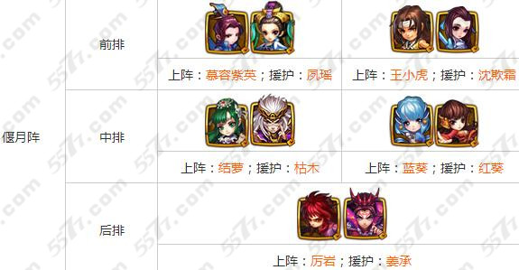如果要用两个肉盾的偃月阵的话,阵型如下,伙伴差不多,前排另外个肉推荐王小虎,还可以的伙伴,过渡使用吧。