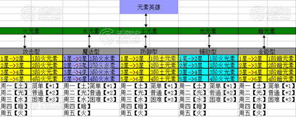 元素英雄就是每日副本中所掉出来的元素,一般有水元素,火元素,土元素,光元素,暗元素。每天挑战每日副本,根据所打的副本难度,对应/简单/普通/困难/可以获得一只1/2/3星的元素。