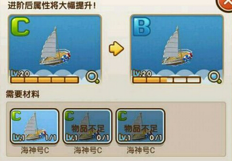 跟汽车不同,船是可以进阶的,即C船可以进阶成B船,B船可以进阶成A船。进阶需达到一定等级,比如C船需达到20级才能进阶。进阶需要消耗船只,C阶海神号要消耗3条C阶的海神号才能进阶到B阶,不小的代价啊。