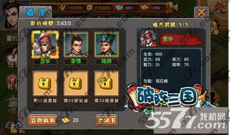 三国名将何其多耶,还记得刘备关羽张飞是在什么地方结识的吗?答案正是酒馆!熙熙攘攘的酒馆每隔一段时间就会刷新,有可能出现意想不到的猛将哦,还请闲暇之余多多光临!搞不好吕布会带着貂蝉一起来你的酒馆品尝美酒噢!