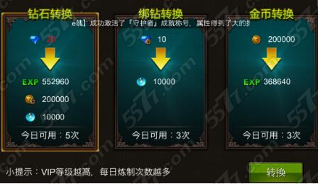 钻石转换一天可以转换5次,通过一定的钻石来换取大量经验、晶壁和星魂值,无奈小编没钻石。