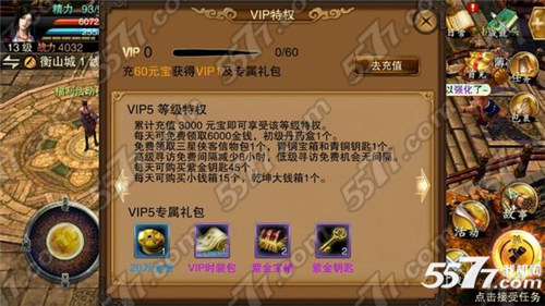 Vip5礼包内容:20万金钱*1、VIP时装包、紫金宝箱*2、紫金要是*2