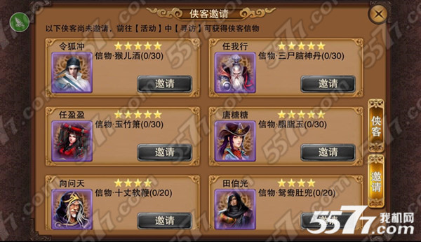 上面就是小编为玩家们介绍的笑傲江湖3D手游侠客信物作用和获得方法,希望小编的介绍对玩家有帮助。更多精彩手游攻略,欢迎关注5577我机网!