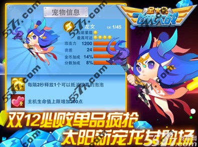第二款太阳级宠物——西游龙女双12重磅登场,她不仅拥有满级1200的攻击力,更有无敌泡泡抵消子弹、主机生命加成变身血霸!