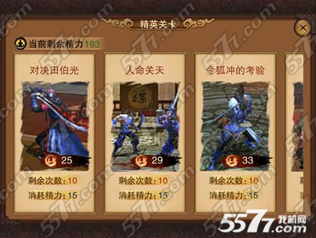 玩家在普通关卡过关后就可挑战精英关卡。经营关卡每天都有挑战限次,难度很高,但是玩家将能从精英关卡中获得大量的金钱,功力,经验以及极品的装备。