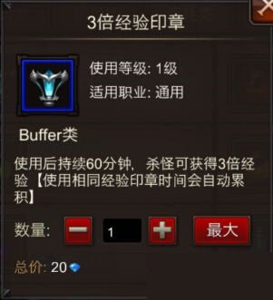 经验印章作用:就目前小编得知的经验印章有3被经验印章,其作用是使用后持续60分钟,杀怪可获得3倍经验。这是一个BUFF类的经验药剂哦,非常给力的一个存在。