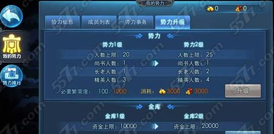 天下HD当中,势力也是有等级之分的。一级的时候,势力只可以有20个人,升级成为2级势力,就可以变成25个人了。在管理的人数方面,也会有一定的改 变。不过想要升级势力,首先,势力当中的繁荣度要达到100,并且需要消耗一定的金钱和木材,升级的等级不同需要消耗的金钱和木材也是不一样的。比如一级 势力想要升级二级势力,需要消耗3000金和3000木材。
