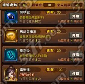 2、仙盟商城中的道具都有着等级需求,只有仙盟商城达到指定等,才能兑换相应的道具。