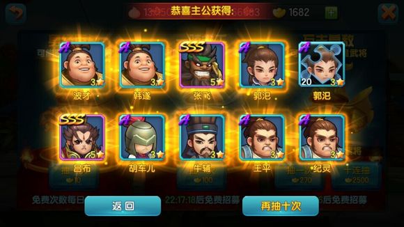 一个号VIP9,抽到3个SSS,刘备+曹操+南华,这个算最好的了,但是还是没有张飞吕布。