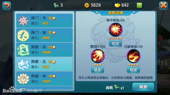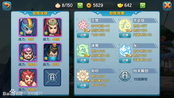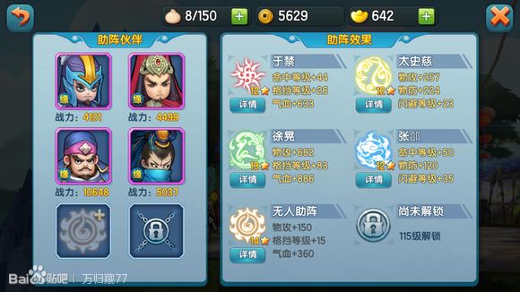 之后,当有了助阵的武将之后,助阵属性会根据助阵武将的属性,按比例增加。根据萨得我的研究,以五星的物攻、气血、闪避命中抗暴等属性为例,物攻增加幅度是助阵武将战力的5%,气血是12%,闪避命中抗暴等则是6‰。