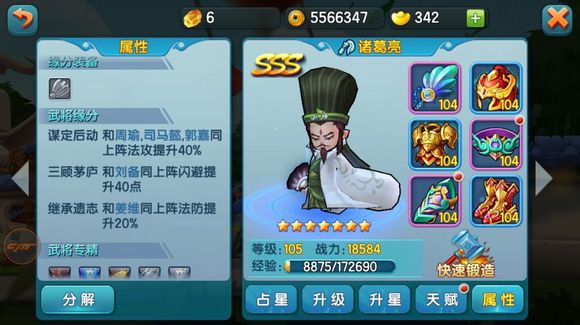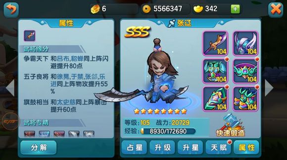 比如我的张辽,加55%攻,紫色缘分武器加3,占星未出任何物攻和会心,能打出的伤害已然达到六万血。