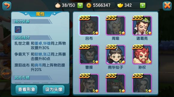 2、乱世之霸与五子良将。吕布和张辽、貂蝉同上阵能激活争霸天下将缘(吕布+80点暴击,张辽+80点闪避,貂蝉+30%法攻),这个将缘已经非常强大,但是要形成强有力的输出流这还不够。徐晃、乐进、张合、于禁、董卓、华雄这六名武将必须在阵容中或助阵小伙伴里,这样才能激活吕布(乱世之霸+30%攻)和张辽(五子良将+55%攻)的强力将缘。这样的攻击暴击兼有的吕布才不负其天下第一的美名。