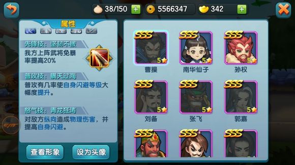 闪避流的主公可以是追求极致闪避的枪主公,也可以是弓主公来弥补后排杀伤力量的不足。