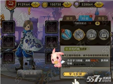 可通过技能面板查看自己所需的技能直接升级或学习,技能最高只能升到与人物同一等级,升级需要消耗技能点(人物每升级一级技能点加一点),如你想继续升级技能,技能点却不够用时,可通过当前技能点右边的小+号,通过消耗技能石(关卡掉落或者副本抽奖获得)来增加技能点,所持有的技能石消耗完之后,可以点击消耗钻石购买。