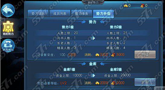 天下HD当中,势力也是有等级之分的。一级的时候,势力只可以有20个人,升级成为2级势力,就可以变成25个人了。在管理的人数方面,也会有一定的改变。不过想要升级势力,首先,势力当中的繁荣度要达到100,并且需要消耗一定的金钱和木材,升级的等级不同需要消耗的金钱和木材也是不一样的。比如一级势力想要升级二级势力,需要消耗3000金和3000木材。