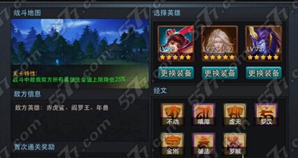 4、战前准备:可以自行选择上阵的英雄和经文,左边会显示对战的敌人,可以根据敌人的特点来选择经文。有时候关卡会有特性,比如仙族英雄伤害提高30%,这时候可以选择用仙族的英雄来上阵。