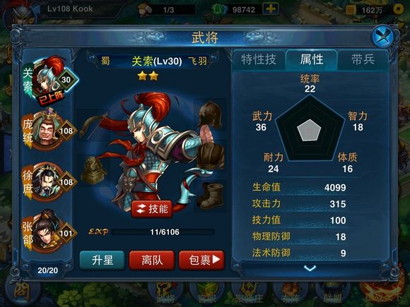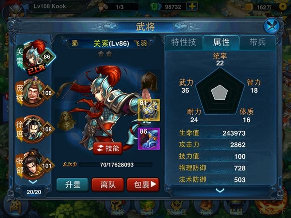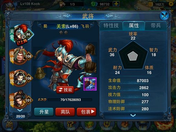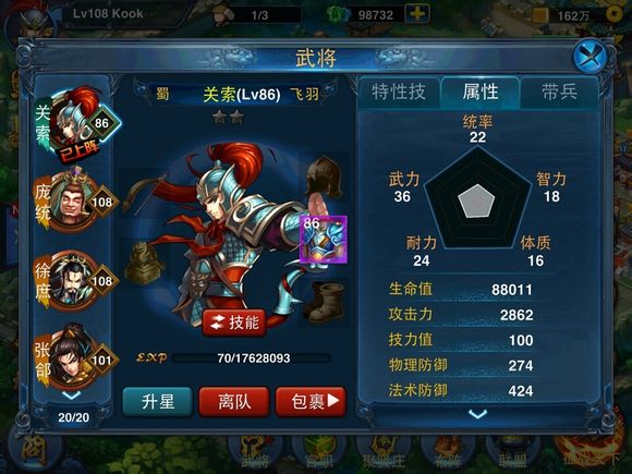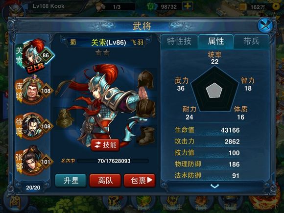 那接下来,我们去把关索等级升到86级,防御增加到了186