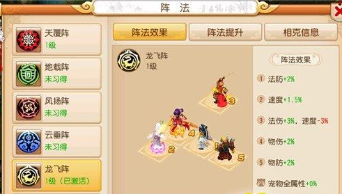 阵法效果:1号位法防+2%,2号位速度+1.5%、3号位法伤+3%,速度-3%、4号位物伤+2%、5号位物防+2%。