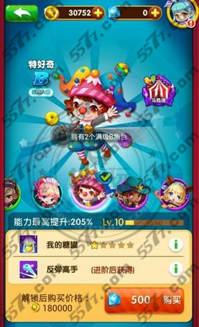 特好奇是来自马戏团的主角,这个角色很靓丽,本人也很喜欢他小丑的滑稽样。特好奇的技能是“我的糖罐”与“反弹高手”,作用是可以激活反弹射线使得游戏玩的更加出色有趣。特好奇要拥有两个满级的B级角色后才解锁。
