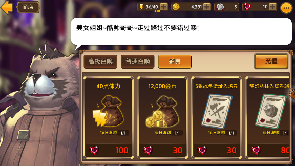 在这个版块中,玩家通过花费钻石来购买“体力、金币、战争遗迹、丛林入场券”这些消耗品,不同于上面两个版块的玩法,这里绝对是一对一明码标价,不需要人品,不用担心花了钻石而无收获,哈哈。