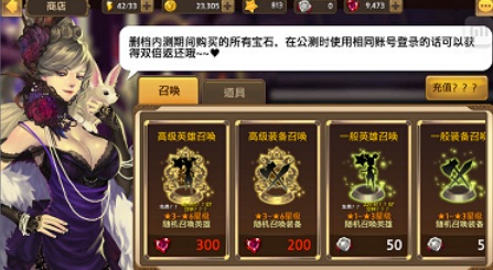 高级英雄召唤:获得3-6星英雄,此召唤会消耗300钻,钻石可以通过充值,完成每日任务,竞技场奖励,世界BOSS奖励,成就等多种方式获得