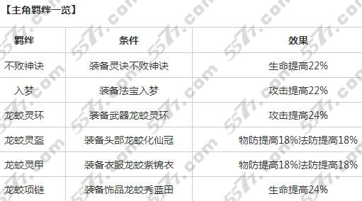 主角羁绊和伙伴不同,除了灵诀和法宝外,其他的几个是一个固定的套装,包括了武器、头部、衣服和饰品四个部位的装备。