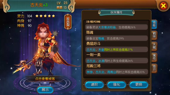 13资质的有两个英雄,古天炎跟洛璃 而看到洛璃的羁绊我就放弃了,牧尘只有V13的礼包送。所以接下来的文章就是围绕古天炎而开始的