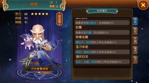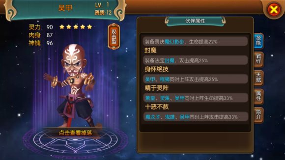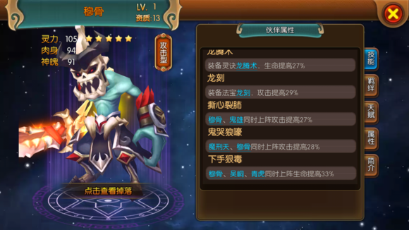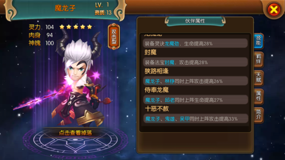 第三个是魔龙子,与林铮有羁绊,40级就送的人物,只是只有前50才有,平民玩家只能慢慢攒了,英雄带的流血加暴击技能,而且对流血状态的敌人有60%格挡,能想象一下敌人被你暴击,他打不着你的感觉 由于是输出型 建议放后排