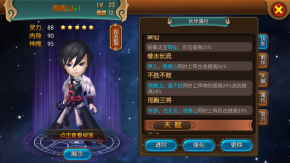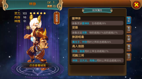 上阵队员介绍完毕,这里我们主要说一下上阵队员的羁绊,游戏为了更完美的搭配羁绊,加设了六个小伙伴的位置。上面五个英雄有的可以互相羁绊,而剩下的羁绊就靠这六个位置一一补齐了。首先周青山 能激活古天炎跟林铮的羁绊