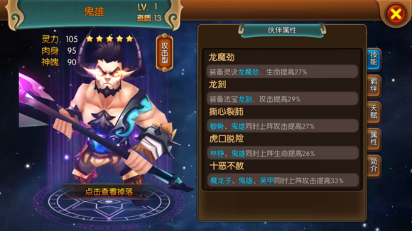 下面这个英雄很屌,“鬼雄” 与魔龙子有羁绊,技能是降低对方怒气 这个技能是逆天的存在 玩过此类游戏的都应该明白这意味着什么,对面被你各种流血 灼伤,而他只能苦逼的平砍你 ,而且英雄超高的攻击跟暴击 ,绝对的菜刀 建议后排
