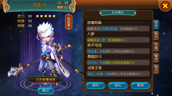 先看古天炎,羁绊在下图中,英雄技能是以灼伤为主,而且是被攻击时有几率触发,因英雄本身物防跟法防较高 所以建议放前排