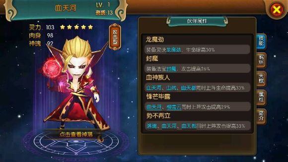上面说到的核心人物血天都理所当然占一个位置,与上阵的【洛璃、方云、血天河】产生羁绊。