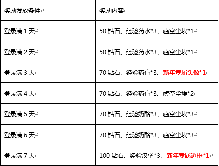 1、活动期间内,只要登录满3天的玩家即可在第3天获得新年专属头像*1;只要登录满7天的玩家即可在第7天获新年专属边框*1。