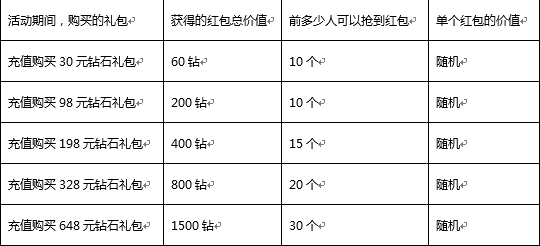 活动内容:活动期间,玩家每个档次的钻石礼包购买时(限30元及以上的档次),可以获得总价值不同的钻石红包,每个档次的红包只能获得一次。红包可以发送到在其所在的公会频道,先点