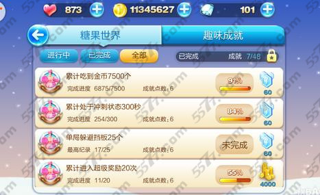 金成就的完成难度就更大了,不过你已经拥有了解锁金成就的能力,想必对糖果世界的障碍分布已经有了相当程度的了解,那么单局跑过7000米对你肯定是不在话下,但累计跑50000米等累计性成就也不是一时半会就能够完成的,最重要的是坚持。