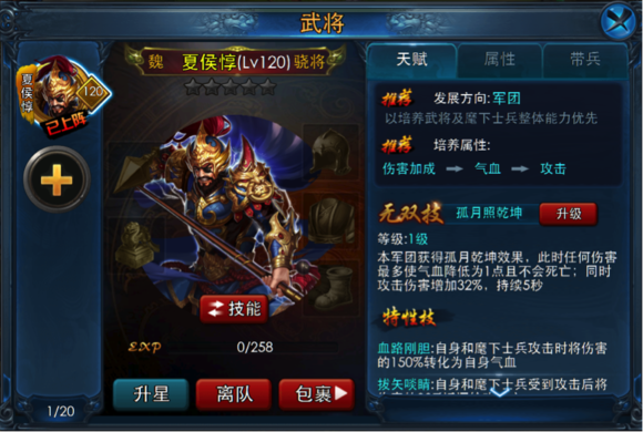 夏侯惇:盲眼夏侯的无双技主要有2方面效果,让本军团在一段时间内近乎无敌,同时提升攻击伤害,可谓不动如山的加强版,可整体提高军团攻守能力。