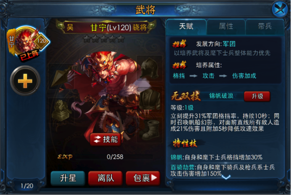 甘宁:甘兴霸的无双技效果和关羽颇有几分相似,只是改为了高伤害+敌方负面Buff+本方存活率提升。一条直线的高伤害和敌军攻速降低效果不用说,绝对的战场神技,而格挡率提升效果,配合甘宁原有的30%格挡特性技,将有效弥补其站场能力不足的弱点。