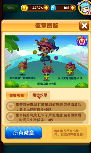 玩家只要集齐角色特好奇和宠物彩虹笨笨、彩虹唐唐、笨小狮,可以点亮马戏团徽章。万家佩戴该徽章后,便可获得关卡无球时额外+5球、时间关失败额外+10秒、罐子分数+40%三大功能,简直就是游戏中的得分神器和紧急救命药。