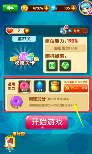 闯关技巧之三便是通用能力的提升,玩家可在开始游戏界面通过金币对通用能力进行升级。通用能力中的消球得分在玩家通过第7关是便可解锁,解锁后每进行一次升级,能力和消除甜甜圈加分都会得到提升;炙热炮击和糖罐分数,在玩家通过第13关和25关时会自动解锁,解锁后升级也是可以提升能力和分数加成。