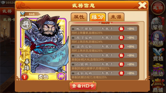 三国杀传奇对缘分的倚重可以说是尽人皆知了,好好的甘宁,搭上一个渣权的缘分,就生生的从第一梯队菜刀降到第二梯队。咱来看看华雄的缘分,缘分不济的武将,再牛B也低人一头。