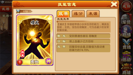 耀武这个技能还是可以的,我一开始玩这个游戏,很郁闷的一点就是,为什么防御将不能提供防御能力的(直到神盾局的出现,不过也他们3个),凌操啊、夏侯惇啊,实际上他们的技能是输出啊,虽然他们是防御将。。。