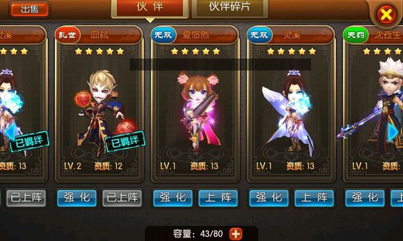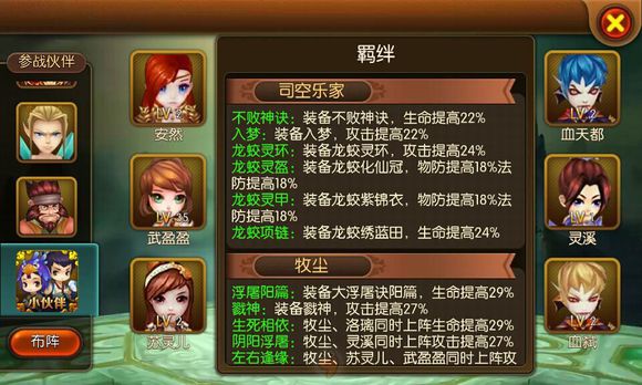 另:武将尽早搞到进阶5以上才能最强。羁伴阵容:武盈盈,苏灵儿,安然,灵溪,血天都,血弑。见图2备用羁伴:王钟,方不胜。 见图3 羁伴相关阵容里的12星武将都升到2级,这样换的时候他们出现在前列好找,武盈盈我现在升到4阶35级,打BOSS用的。主力神将除牧尘暂时无处得外,柳青云,方云可以招募,但几率很小。