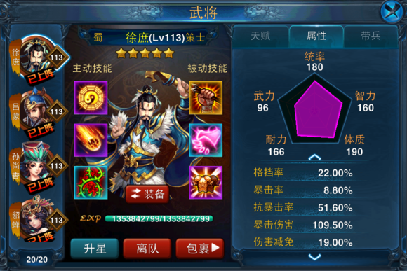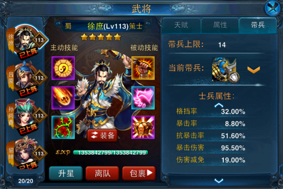 20的盾牌兵也是51.6%抗暴击——如果是扇子兵,就要再增加一些。(此徐庶官职刷到征x将军,0部件,如果刷满,应该再增加5%的抗暴击)