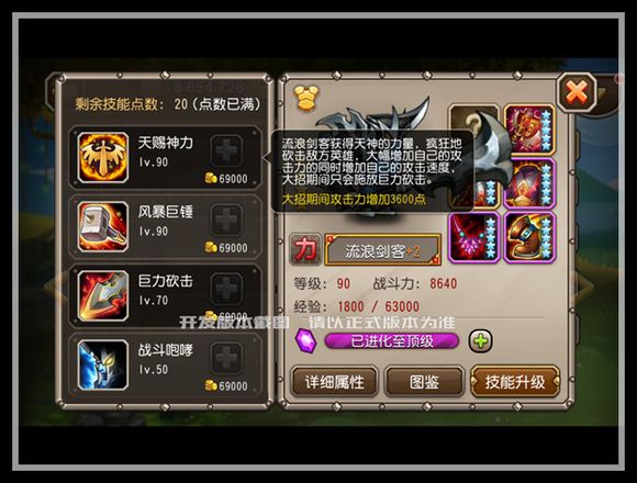 【技能介绍】天赐神力(大招):流浪剑客获得天神的力量,疯狂地砍击敌方英雄,大幅增加自己的攻击力的同时增加自己的攻击速度,大招期间只会施放巨力砍击。